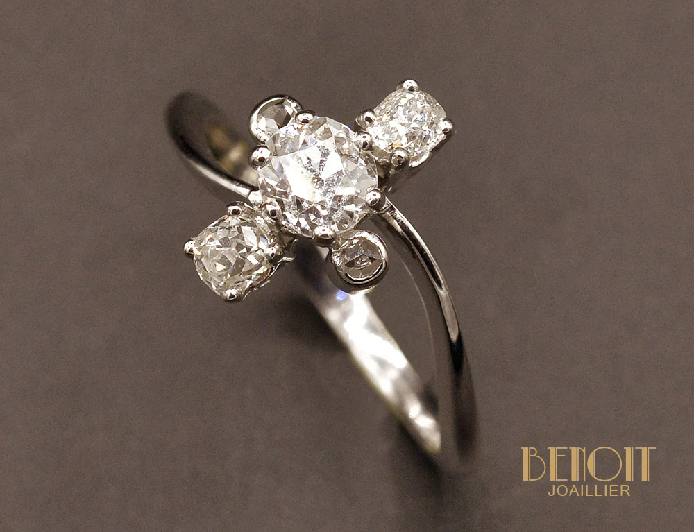 Bague en or blanc 750 millièmes dont la tête de bague est composée d'un diamant principal taille ancienne serti de six griffes, entouré en haut et en bas de deux diamants taille ancienne sertis sur chatons quatre griffes et de part et d'autre de deux diamants taille rose sertis en clos. Le corps de bague minimaliste rejoint asymétriquement la tête de bague.