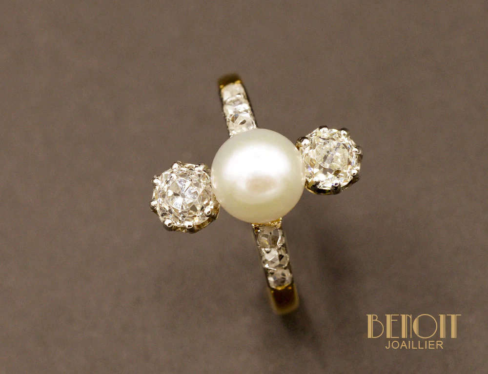 - Pierres : Perle fine ø 6,5 mm, Diamants taille ancienne 2 x ~0,30 ct