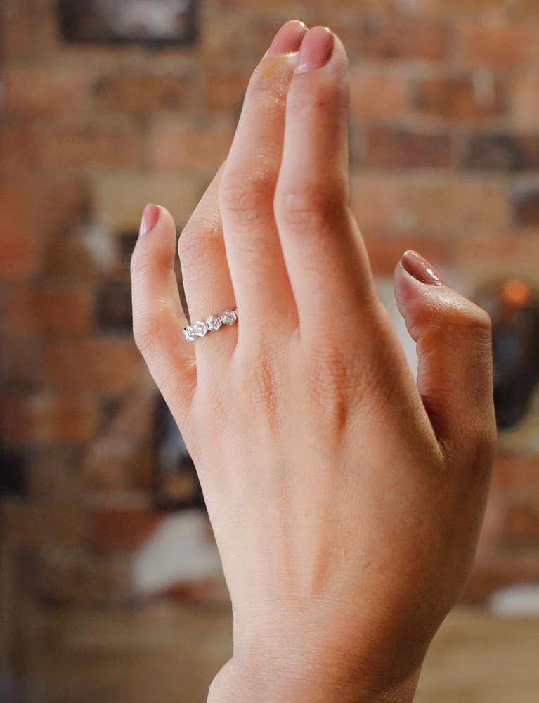 Alliance Création Benoit Joaillier en or blanc 750/1000e, inspirée du travail de mises à jour appelé "nid d'abeille". Composée entièrement d'hexagones sertis chacun d'un diamant pour un poids total 0,96 carat. Possibilité d'en réaliser sur mesure.
