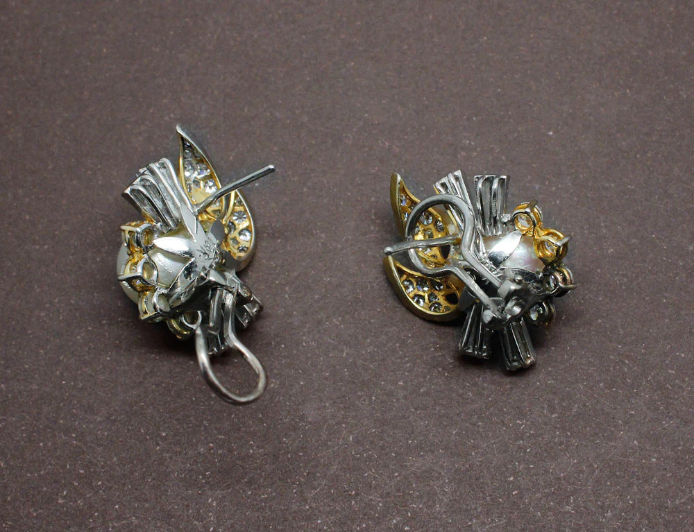 Boucles d'oreilles de fabrication récente, en or jaune et blanc 18K, d'inspiration florale. Chaque boucle est composée d'une perle blanche de culture entourée de quatre diamants baguettes, quatre diamants ronds montés sur chatons trois griffes, et deux "pétales" d'or jaune pavés de diamants. Système de tiges et "raquettes" pour oreilles percées (adaptable pour oreilles non percées sur demande).