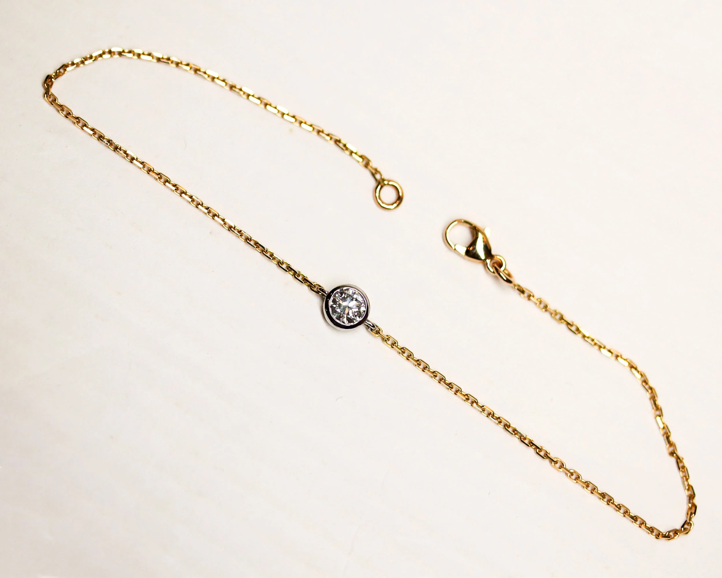 Bracelet solitaire Création benoit Joaillier en chaine maille forçat limée en or rose 750/e, orné, en son milieu, d'un Diamant taille brillant serti dans un clos en or blanc. Fermoir menotte en or rose. Peut se porter avec le F1951-B en accumulation.
