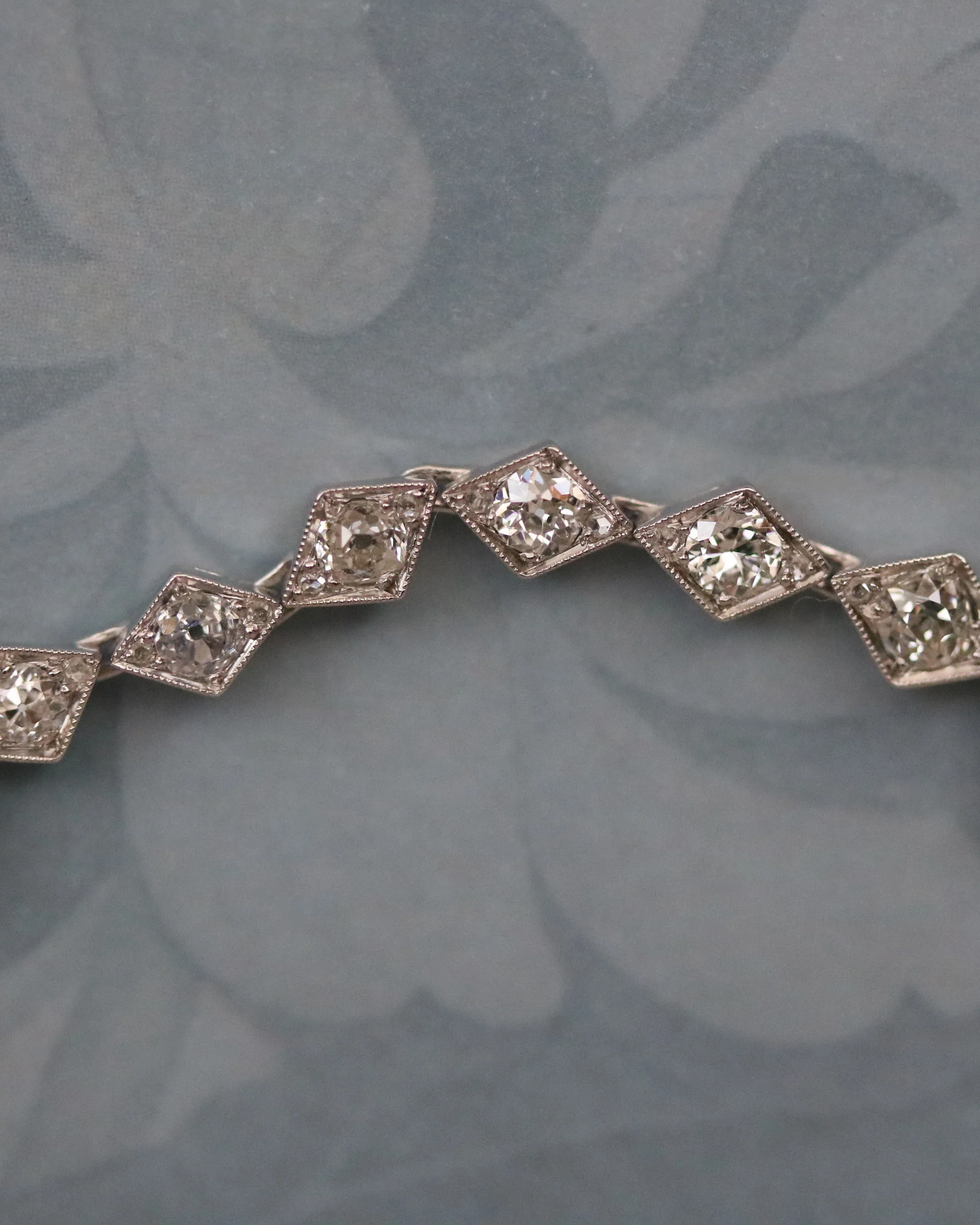 Bracelet rivière en or blanc 750 millièmes, composé de 26 mailles articulées en fuite, chacune en forme de losange. Chaque maille est ornée d'un diamant taille ancienne, délicatement épaulé par deux diamants taille rose, le tout serti en clos perlé. Un bijou d'une grande élégance, en bon état.