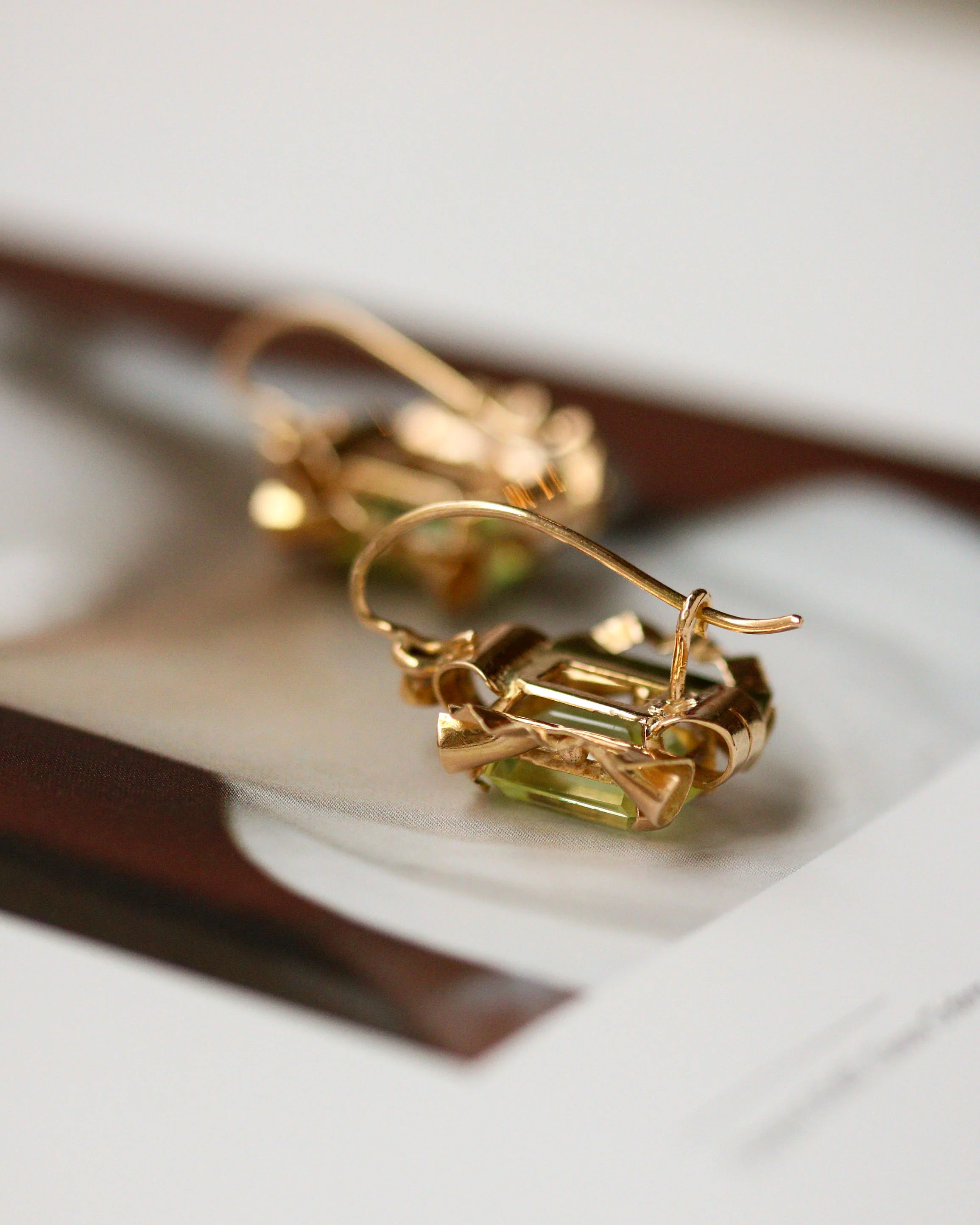 Paire de boucles d'oreilles de style tank en or jaune 750 millièmes, composé de différentes formes représentant un noeud, dont le centre est serti d'un Fluorite rectangulaire sur griffes. Système de fermeture col de cygne avec crochet de sécutité. Bijou rare et original. Très bon état.